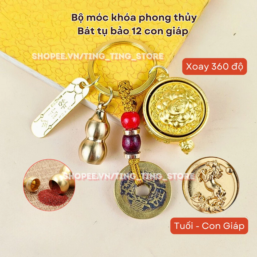 🔥 Móc khóa phong thủy Bát tụ bảo nắp xoay, bộ móc chìa khóa bát tụ bảo 12 con giáp – tặng kèm chu sa đang giảm giá!